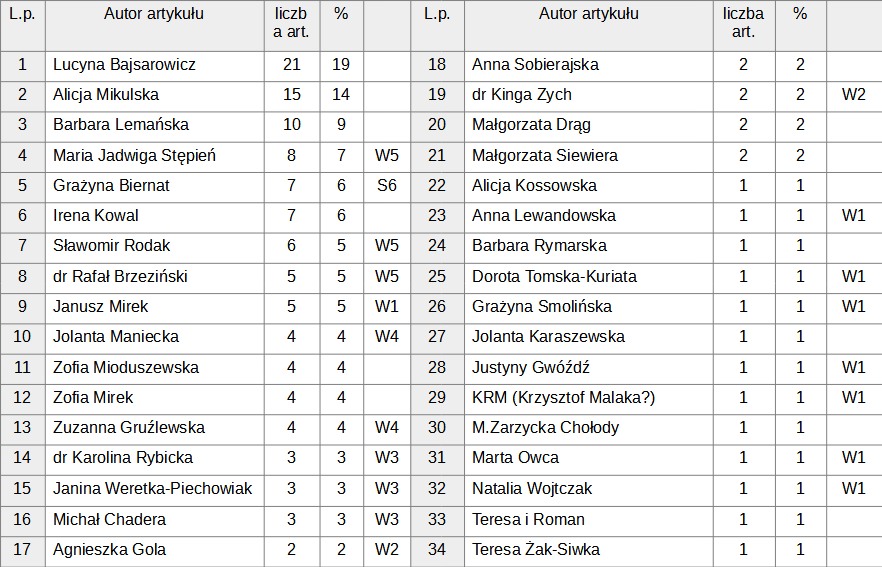 Kolejne tabele przedstawiają naszych wolontariuszy. Autorów artykułów było 34 (22 w roku 2024).