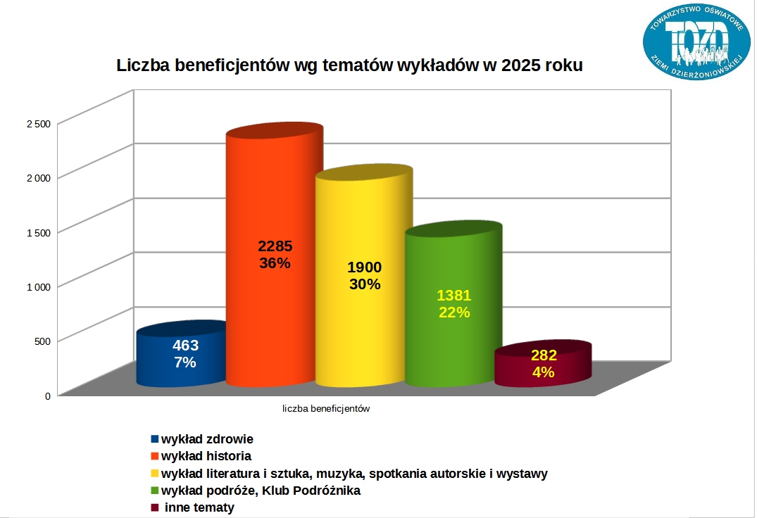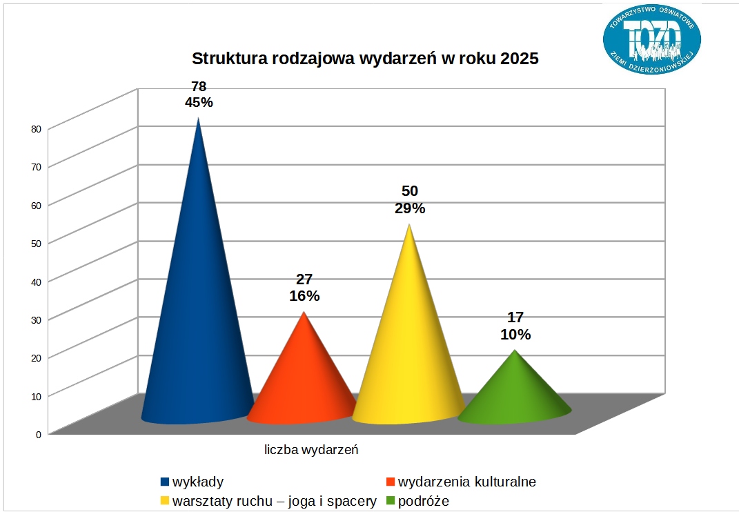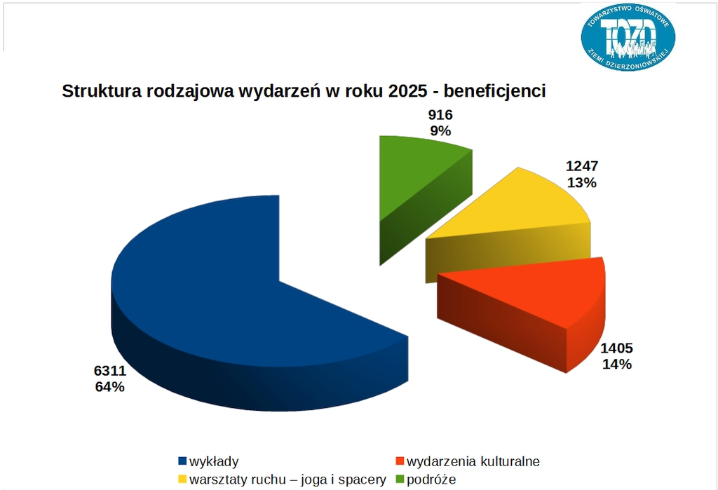 Z tego zestawienia i wykresów widać, że wykłady są podstawową i dominującą sferą naszej działalności (45% wydarzeń), umożliwiającą uczestniczenie w nich wszystkim chętnym (64% beneficjentów).