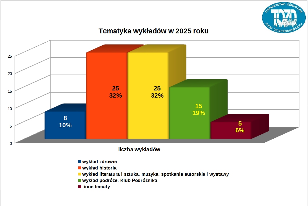 Wykłady podzielone na główne tematy wskazują na zagadnienia, których ciągle jesteśmy ciekawi. Należy tu podkreślić dużą frekwencję na wykładach historycznych. Nie narzekają na popularność wykłady z literatury i szeroko pojętej sztuki oraz tematy turystyczne i krajoznawcze realizowane z Klubem Podróżnika.
