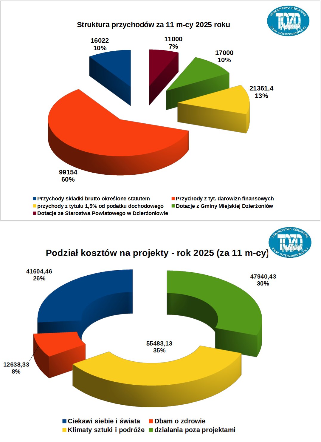 Na początek przedstawię strukturę przychodów za rok 2025 (za 11 -cy). 83% (w roku 2024 było 80%) przychodów stanowi wkład własny w naszą działalność, są to: składki członkowskie, darowizny i 1,5% z podatków z PIT.