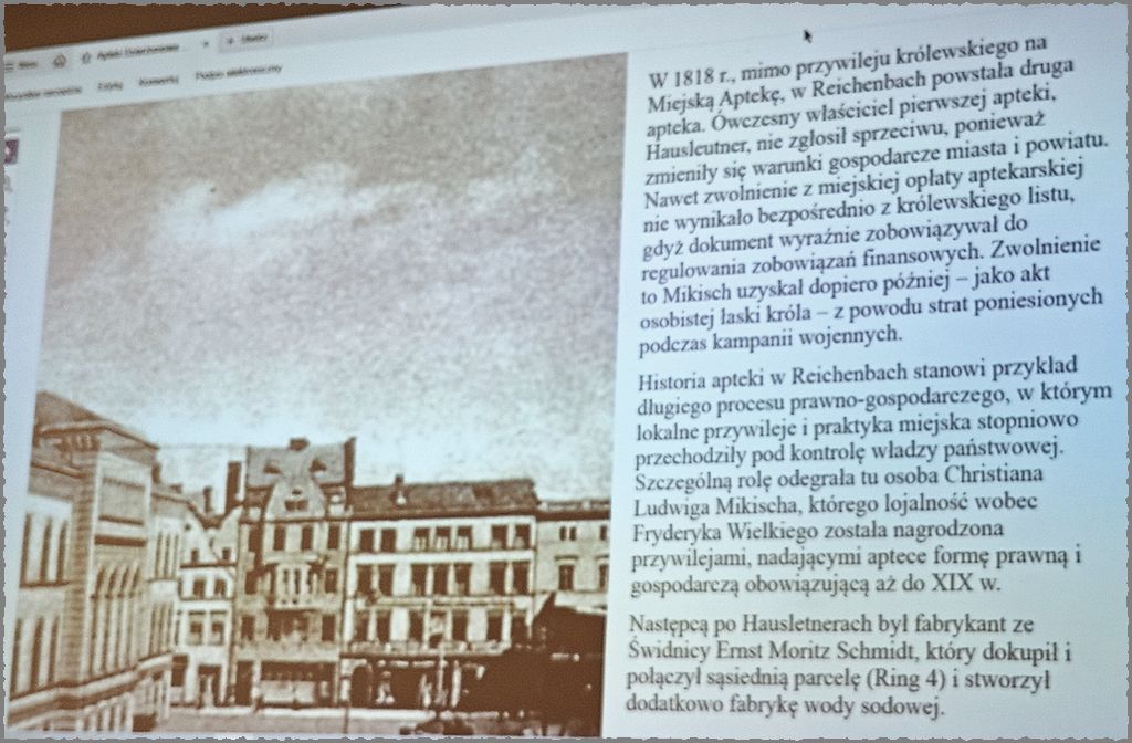 Prawo aptekarskie, które miasto początkowo wydzierżawiało w XVII w. ewoluowało tak, że stało się przedmiotem publicznego ruchu. Jak zauważa dzierżoniowski kronikarz miejskiej apteki Lauterbach: „(...) początkowa, być może własność miejska, po przez wydzierżawiania prawa aptekarskiego przeszła praktycznie do istoty koncesji (...)”. Jak również podkreśla, tę formę koncesji zainicjowano w okresie pruskim. Od tego czasu apteka nieprzerwanie pozostawała w rękach kolejnych właścicieli – łącznie trzydziestu aptekarzy.