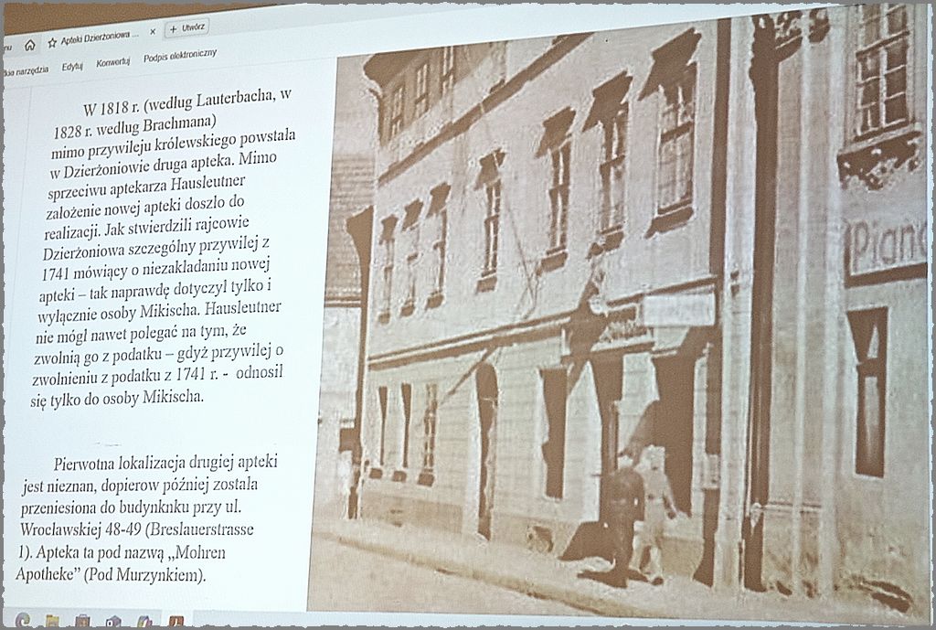 W 1818 r. (według Lauterbacha, w 1828 r.) mimo przywileju królewskiego powstała w Dzierżoniowie druga apteka. Pierwotna lokalizacja drugiej apteki jest nieznana, dopiero później została przeniesiona do budynku przy Breslauerstraβe 1 (ul. Wrocławska 48-49). Aptekę tą, pod nazwą „Mohren Apotheke” (Pod Murzynkiem), posiadał Conrad Bauch (ur. 1870 r.). Apteka od 1921 r. traciła płynność finansową. W latach 40. XX w. aptekę posiadał i prowadził Georg Müller.