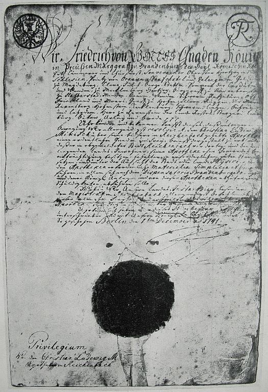 Początkowo prawo aptekarskie było dzierżawione przez miasto, lecz w XVII w., poprzez połączenie z transakcjami nieruchomościowymi, stało się przedmiotem obrotu prywatnego. W roku 1732 „Stadt Apotheke” (Miejska Apteka) znalazła się w rękach aptekarza Franza Müllera i mieściła się w domu przy Ring 5 (Rynek 19). W 1738 r. dom nr 5 (Rynek 19) wraz z prawami aptekarskimi zakupił Christian Ludwig Mikisch, syn burmistrza z Poczdamu.