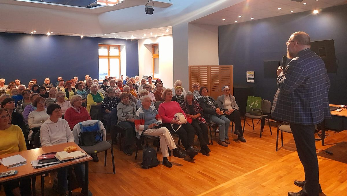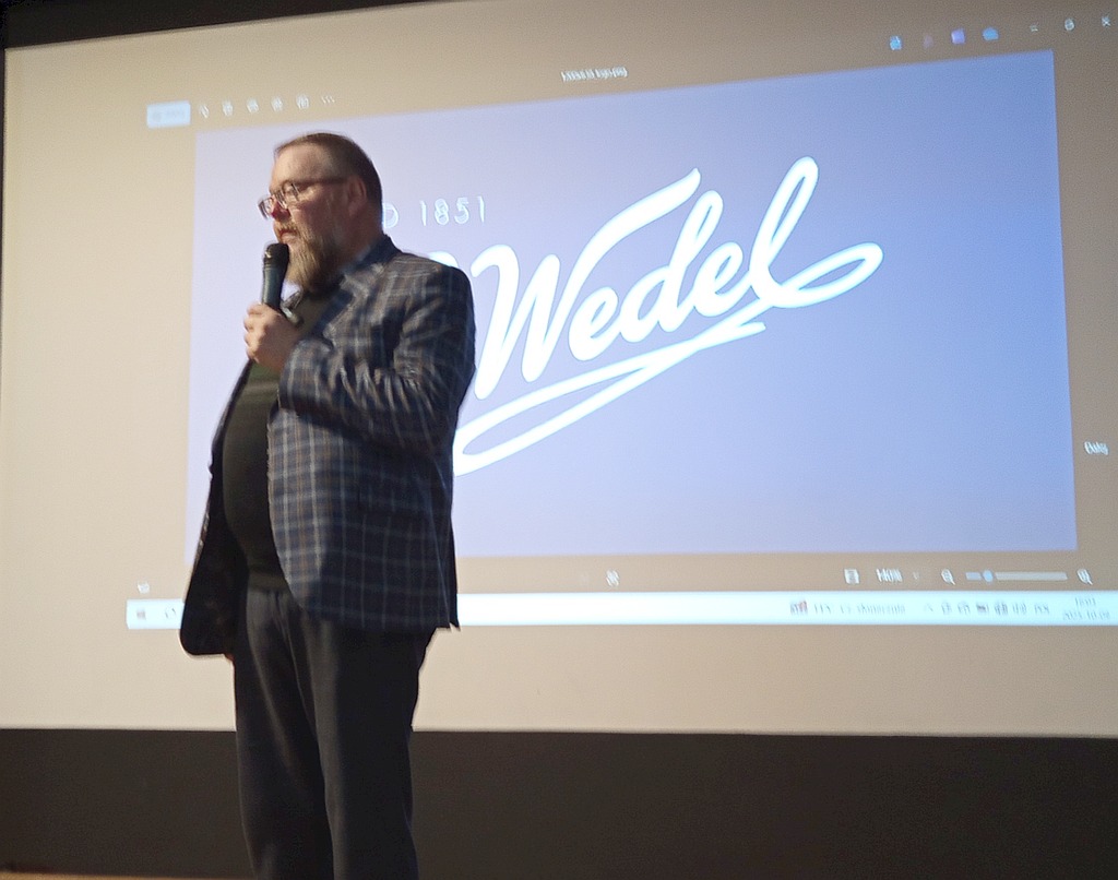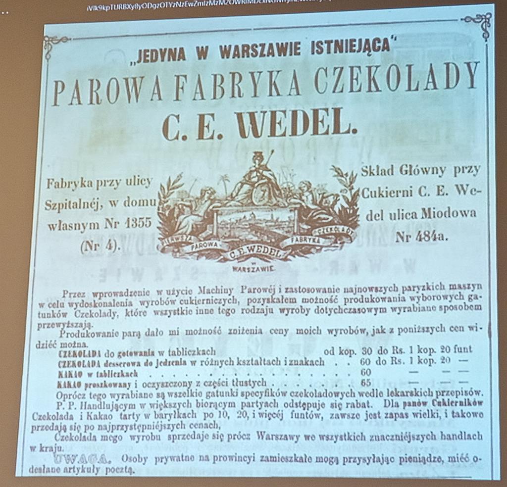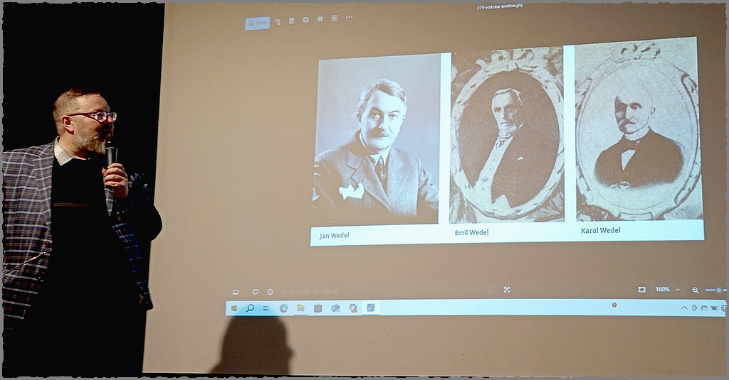 Kto w czwartkowe popołudnie 9 października 2025 roku nie przestraszył się dżdżystej pogody, mógł w DOK-u wysłuchać kolejnego ciekawego wykładu Romualda Wojciechowskiego, tym razem na temat „Słodkie królestwo – historia firmy Wedel”. Popłynęła barwna, ilustrowana fotografiami, opowieść o początkach i rozwoju działalności założonej w Warszawie w 1851 roku przez Karola Wedla (1813-1902) rodzinnej, słynnej do dziś, firmy cukierniczej, którą kierowali później jego syn – Emil Wedel (1841-1919), to od jego czasów istnieje znane w świecie do dziś logo tej firmy – faksymile podpisu właściciela: „E. Wedel”, sygnujące każdą kostkę czekolady produkowaną w tej fabryce słodyczy); i wnuk – Jan Wedel (1874-1960), w latach 30. XX wieku budowniczy nowoczesnej fabryki czekolady na warszawskiej Pradze.