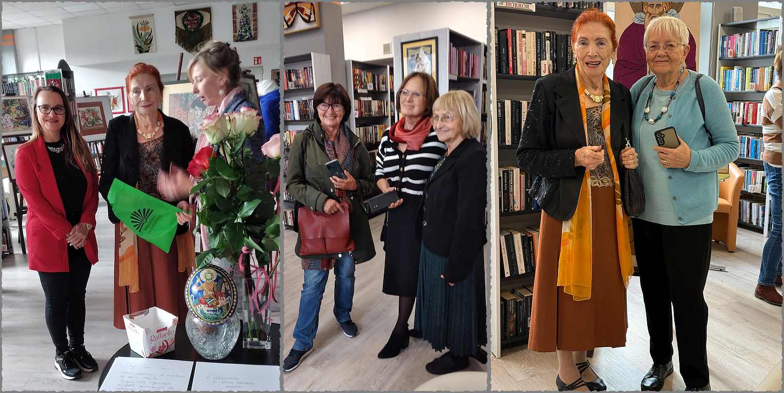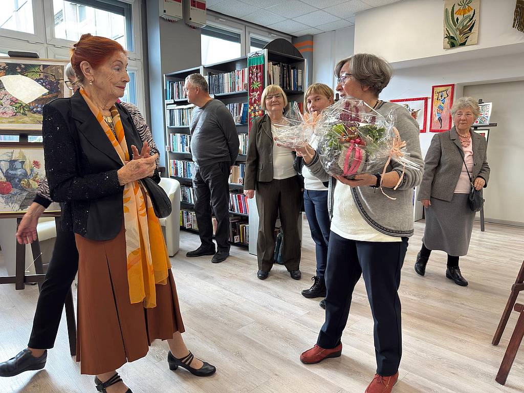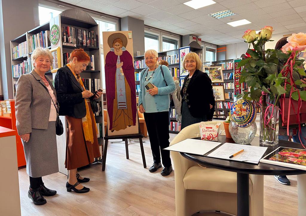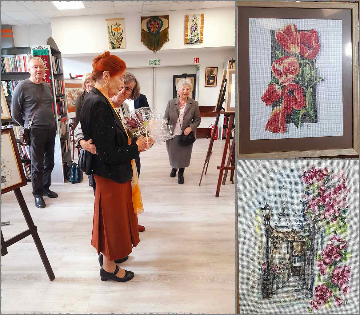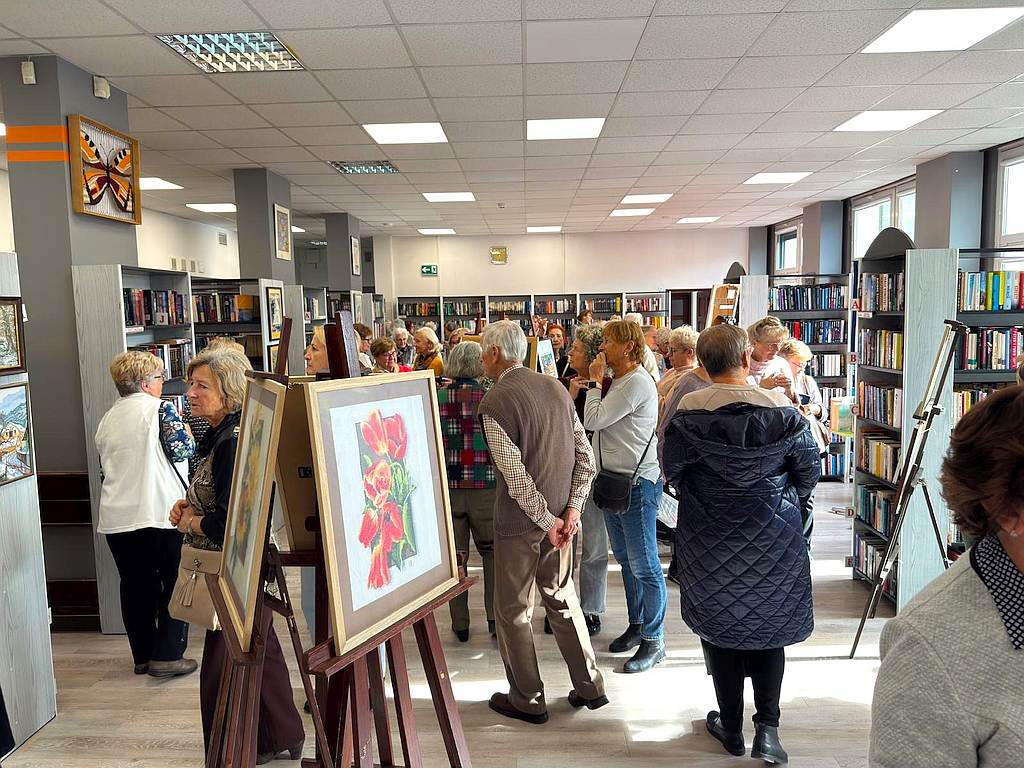 A spotkanie uświetniła pięknie zorganizowana (wśród regałów z książkami) wystawa dzieł autorki potwierdzająca jej aktywność twórczą i perfekcyjne opanowanie warsztatu.