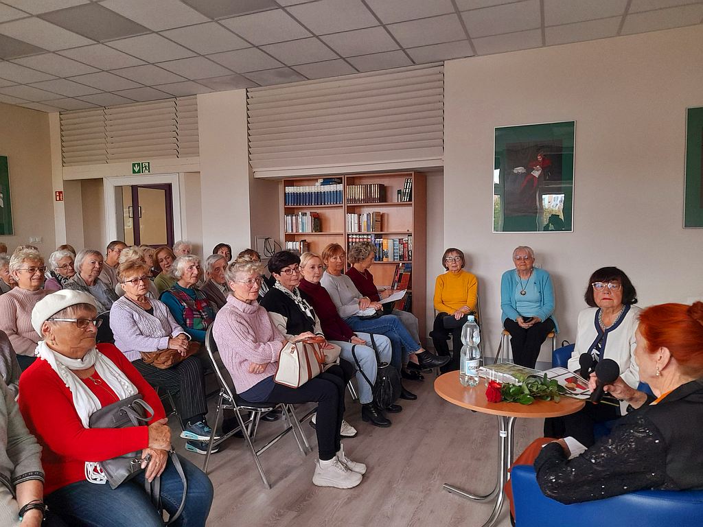 „Nie wyrastaj z marzeń” te słowa i wiersz Joanny Kulmowej o takim samym tytule były myślą przewodnią dzisiejszego spotkania  (21.10.2025 roku) z lokalną artystką p. Ireną Bogucką-Węgiel. Spotkanie miało miejsce w filii biblioteki dzierżoniowskiej a rozmowę z twórczynią prowadziła p. Maria Zarzycka-Chołody.