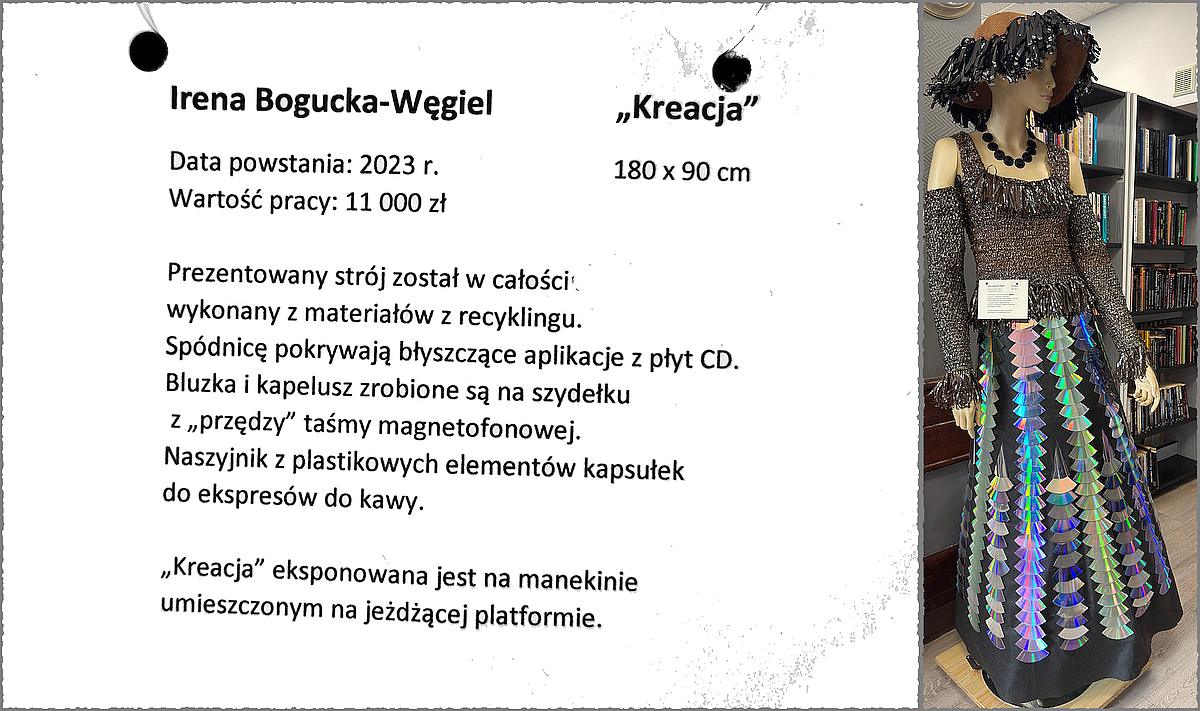 Pani Irena Bogucka-Węgiel, z zawodu inżynier mechanik, jest mistrzynią pędzla, igły, szydełka, nici i wielu innych rzeczy pochodzących najczęściej z recyklingu. Jest autorką licznych prac malarskich i rękodzieła artystycznego, rzeźb i instalacji. Brała udział w wielu konkursach i wystawach zdobywając nagrody i wyróżnienia, uczestniczyła w plenerach malarskich, także w aukcjach charytatywnych. Jej prace  znajdują się w domach prywatnych w kraju i za granicą, zdobią też wnętrza obiektów użyteczności publicznej.
