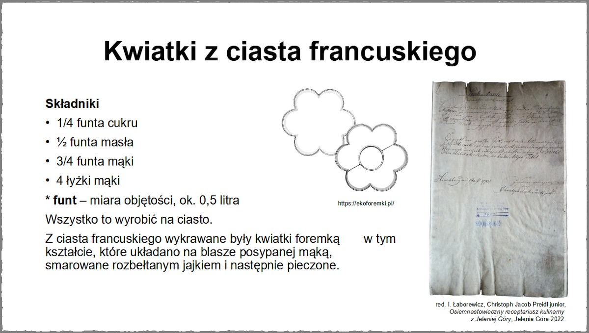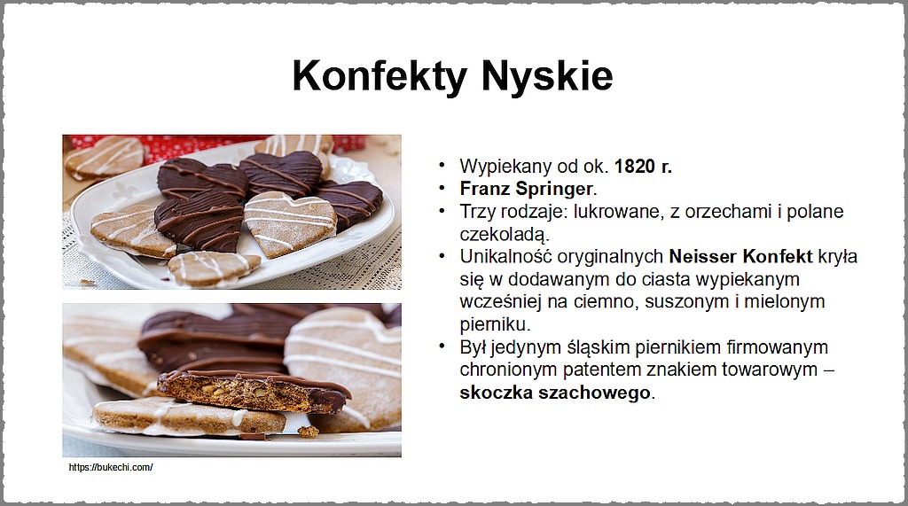 Przedwojenni mieszkańcy Dolnego Śląska chętnie raczyli się słodkimi specjałami-piernikami, ciastami i drożdżowymi wypiekami. Prawdopodobnie najczęściej jadanym wyrobem cukierniczym był piernik, który był wypiekany na tych terenach od XIII w. Do miana piernikowej stolicy regiony rościło sobie prawa wiele miast m.in. Bardo, Niemcza, Świdnica, Wałbrzych i Wrocław. Pierwsze pierniki wcale nie przypominały tych pieczonych obecnie i nazywane były „ciastkami z pieprzem”. Z czasem zaczęto do nich dodawać takie przyprawy jak: anyż, cynamon, gałka muszkatołowa, kardamon oraz skórkę cytrynową i pomarańczową. Piernikarstwo przyczyniło się także do rozwoju rzemiosła, ponieważ zaczęły powstawać coraz to bardziej różnorodne w kształtach drewniane formy piernikarskie. Piernik nie był tylko korzennym przysmakiem, był również podarunkiem, pamiątką i ważnym elementem obrzędowości.
