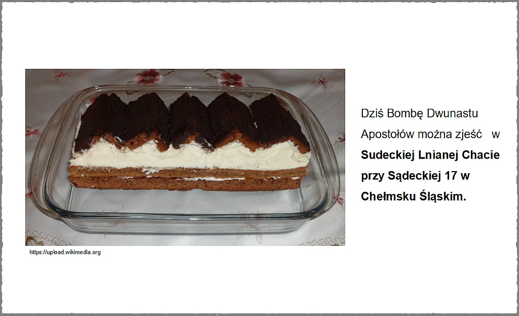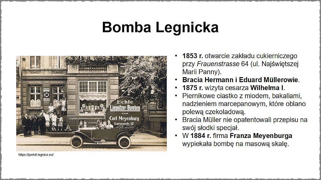 Jednym z flagowych wypieków z Dolnego Śląska była Bomba Legnicka, która powstała z okazji wizyty cesarza Wilhelma I w Legnicy w 1875 r. Miejscowi cukiernicy bracia Hermann i Eduard Müllerowie z tej okazji przygotowali nowy wypiek - piernikowe ciastko z miodem, bakaliami, nadzieniem marcepanowym, które oblano polewą czekoladową. Nie wiadomo, czy Bomba Legnicka przypadła do gustu monarsze, ale zdobyła podniebienia i serca mieszkańców tych ziem. Kolejny korzenny wypiek pochodzi z Chełmska Śląskiego, gdzie w 1927 r. Fritz Schubert opracował przepis na Bombę 12 Apostołów. Ciasto składało się z: piernika, powideł śliwkowych, bitej śmietany i polewy czekoladowej. Swoim kształtem nawiązywało do oryginalnych drewnianych Domów Tkaczy Śląskich z początku XVIII w.