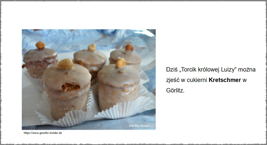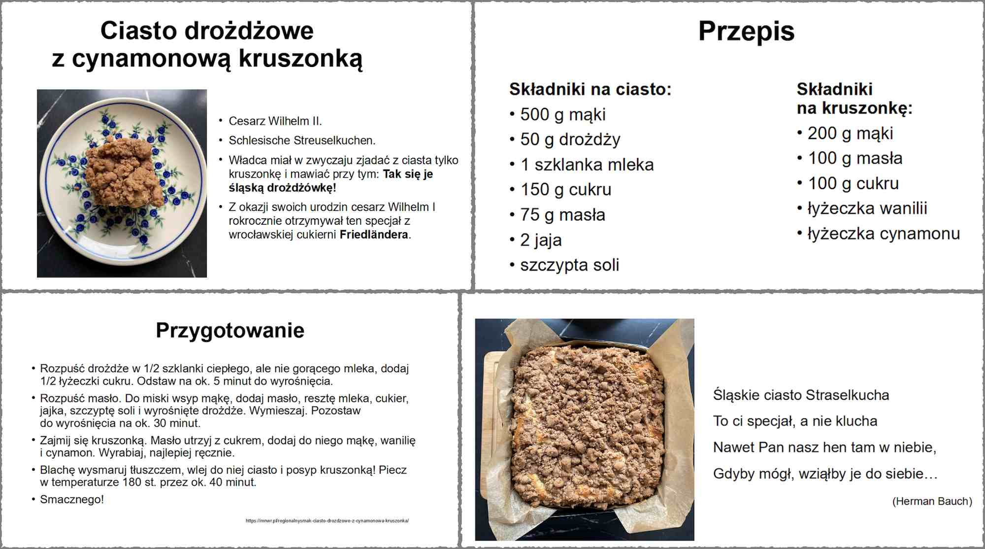 We Wrocławiu powstał torcik królowej Luizy, który wyglądem przypominał Śnieżkę w zimowym wydaniu. Całość zwieńczona była lukrową koroną. Przepis opracował szwajcarski cukiernik Conrad Perini, który w swojej cukierni zaczął podawać torcik w zestawie z kawą. Nie sposób nie wspomnieć też o śląskiej drożdżówce z cynamonową kruszonką – przysmaku cesarza Wilhelma II, który podobno zjadał z ciasta tylko kruszonkę, wypowiadając przy tym słowa: „Tak się je śląską drożdżówkę!”. Ten specjał był jadany przez dawnych mieszkańców regionu do popołudniowej kawy lub herbaty, ale był też punktem kończącym niedzielny obiad. Drożdżowy przysmak doczekał się nawet wiersza pt. „Sträselkucha”, autorstwa Hermanna Baucha.
