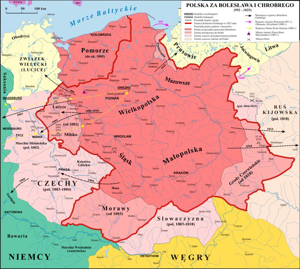 Pierwszym koronowanym królem Polski był Bolesław Chrobry (967-1025) jak już wspomniałam był synem Mieszka i Dobrawy. Kluczowe fakty jego panowania to zjazd gnieźnieński z cesarzem Ottonem III, utworzenie metropolii kościelnej, liczne wojny z Niemcami zakończone pokojem w Budziszynie (1018), wyprawa na Ruś (1018) zakończona zdobyciem Kijowa. Koronacja Chrobrego nastąpiła tuż przed jego śmiercią w roku 1025. Przydomek „Chrobry” oznacza dzielny lub odważny co dobrze odzwierciedla jego charakter i zasługi w licznych wyprawach wojennych i militarnych sukcesach.