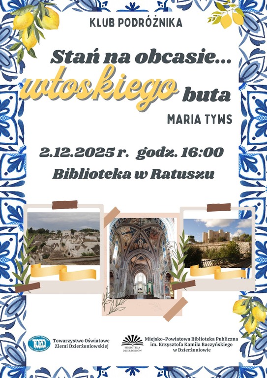 Na ostatnim w tym roku spotkaniu Klubu Podróżnika (02.12.2025 r.) polecieliśmy na tzw. „obcas włoskiego buta” czyli do słonecznej i coraz bardziej atrakcyjnej Apulii.
